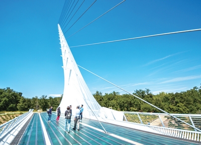 日晷橋由西班牙設計師Santiago Calatrava設計,全長720英呎,橫跨滾滾綠水的沙加緬度河流,像是一隻在空中展翅的大雁。懸臂式斜橋樑拉起了鋼纜支撐整座橋,橋面覆蓋了2,245片玻璃,在太陽底下閃耀著光芒。除了其藝術功能之外,也同時達到計算時間的功用,太陽照射下,落在草地上的時間刻度,高度展現古人的智慧,據說在6/21夏至前後最為精准準。