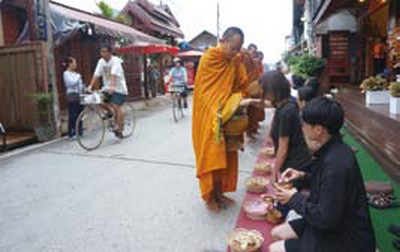 雷府境內的清康(Chiang Khan) 可說是湄公河畔最迷人的小鎮,保 留了多棟數十年甚至上百年的泰式 木造建築,漫步於這條老街有如進 入時光隧道,懷舊氛圍吸引遊人 駐留。木屋改造的咖啡館、餐廳、 旅宿等各有特色,傍晚時還能逛逛 文創小舖,選購手工藝品和特色紀 念品。拂曉時分,街上居民席地而坐,當附近寺廟僧侶步行經過時, 布施食物、飲料以及仍有餘溫的糯米飯,僧侶則念誦一段經文為施者祈福,這一施一捨之間傳遞的溫暖,格外令人動容。