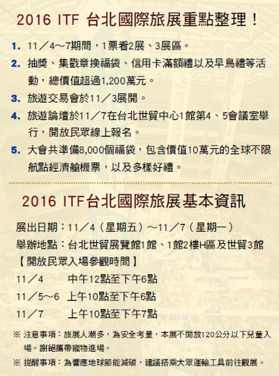 ITF2016台北國際旅展11/4~7 隆重登
