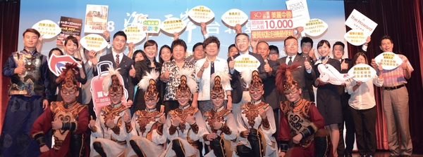 ▲(第2排左4起)中國東方航空台灣分公司總經理施海波、海峽兩岸旅遊交流協會台北辦事處主任任佳燕、台灣旅遊交流協會理事長賴瑟珍,與參展單位、表演團體於展前發表記者會。