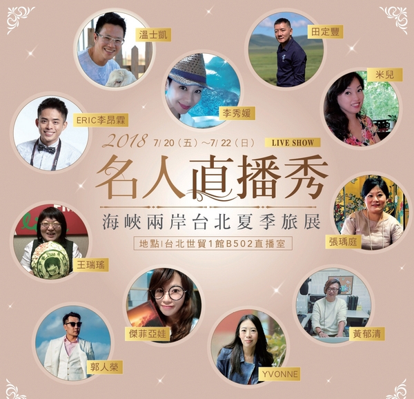 「2018海峽兩岸台北夏季旅展」更突破以 往,特別邀請到台灣知名主持人李秀媛、旅 遊達人溫士凱、明星旅遊作家Eric李昂霖、 文創藝術家田定豐、美食家王瑞瑤和張瑀 庭、玩樂主播郭人榮等當紅名人及部落客, 以「名人直播」創新模式,分享大陸旅遊 樂趣和攻略,讓現場民眾聽得如癡如醉, 並同步以線上直播方式,充分發揮社群擴 散效應,將大陸旅遊魅力「直播」全台。