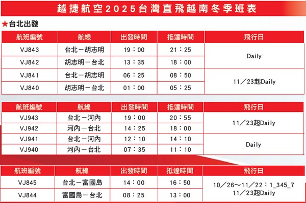 越捷航空作為越南最大的民營航空公司,以具競爭力的票價、創新服務、安全飛行服務等,榮獲2025年全球最安全低成本航空公司之一。根據統計,2024年台越之間每週共累積96個航班往返,逾85萬人次搭乘,平均載客率達75%。航網遍及東南亞、東北亞、中亞和澳洲,共計14個國家及地區,串聯98座機場,每日約有420個國內外航班執飛。