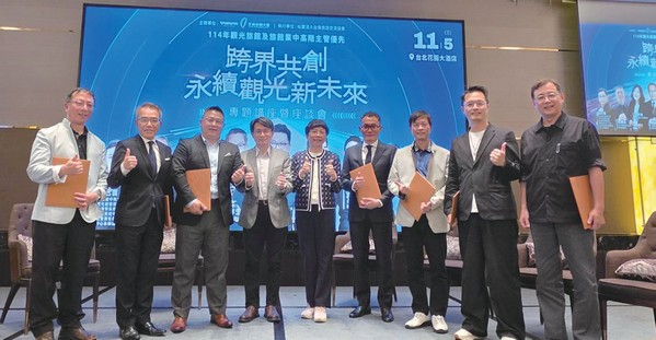 ▲(左起)交通部觀光署日月潭風景區管理處處長柯建興、遠雄遊憩休閒事業董事長武祥生、高雄餐旅大學研究所教授劉喜臨、交通部觀光署旅宿組科長張俊明、台灣旅遊交流協會執行委員會主委賴瑟珍、台北晶華酒店董事總經理吳偉正、台灣休閒農業發展協會祕書長游文宏、台灣國民旅遊發展協會理事長蔡子建、台中教育大學教授拾已寰。