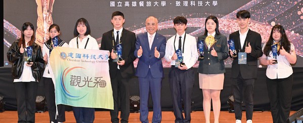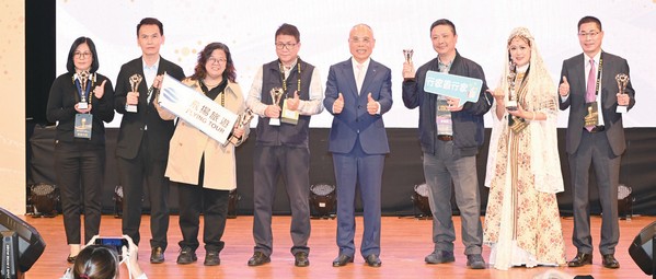 ▲旅行業品質保障協會理事長張永成(左5)頒發國際金旅獎校園組。(得獎學校:台北市立大學、蘇澳高級海事水產職業學校、建國科技大學、淡江大學、台北城市科技大學、高雄餐旅大學、致理科技大學)