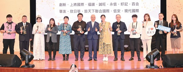 ▲旅行業品質保障協會理事長張永成(左5)頒發品保優旅選給獲獎業者。(得獎業者:名家旅行社、飛揚旅行社、微風旅行社、五福旅行社、台灣中國旅行社、現代國際旅行社、長汎旅行社、寶豐國際旅行社)