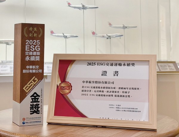 中華航空(以下簡稱華航)深耕企業永續發展備受肯定,繼奪下台灣企業永續獎「台灣10大永續典範企業獎」後,於第2屆「ESG交通運輸永續獎」評選再度獲頒金獎最高殊榮,成為唯一蟬聯2屆獲獎的航空業者。華航也獲邀分享實務成果,期能拋轉引玉,引領業界實踐永續理念,共同精進邁向淨零轉型發展目標。「ESG交通運輸永續獎」由交通部指導,台北市交通文教基金會與社團法人台灣全球商貿運籌發展協會共同主辦。華航憑藉完善且明確的ESG治理架構及具體永續作為,自30餘家參選企業中脫穎而出,連續2屆榮獲金獎殊榮。針對蟬聯獲獎者,獎座上也特別印有「精進創新」字樣,展現主辦單位對華航持續深化永續作為的肯定及期許。