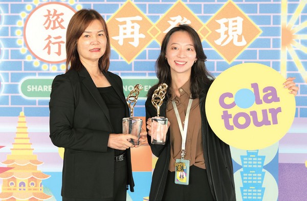 ▲可樂旅遊可說是當日最大贏家,除了副總經理萬麗香(左)榮獲台灣觀光金獎「旅行業從業人員」組外,華語、英語領隊魏宏展也同樣在「領隊及導遊」組獲獎,由歐洲線線控蘇郁茹(右)代領。