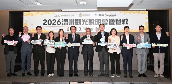 由濟州特別自治道與濟州觀光公社共同主辦的「2026濟州觀光說明會暨餐敘活動」於3/18假台北寒舍艾美酒店舉行,現場有來自濟州島的業者來台交流,期盼藉由說明會與餐敘的方式,讓台灣業者深入了解濟州島的旅遊魅力。