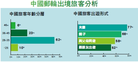 戴卓爾.布朗分享了最新的中國郵輪旅客調查分析,目前搭乘郵輪出境的中國旅客,年齡層有往下降的趨勢,其中26至35歲的旅客就佔了62%,36至45歲則次之,約佔23%。在中國還有「三明治旅客」的現象搭乘郵輪的旅客多以小家庭為主,例如:父母親帶著一位小孩,或年輕人帶著父母一同出遊,而這也是中國郵輪消費市場的特色。