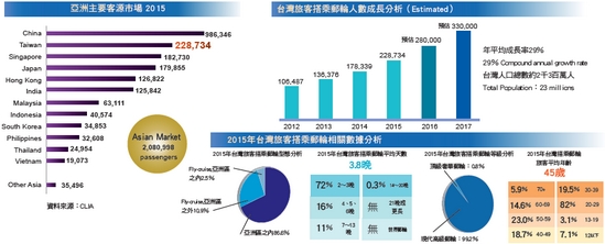 吳勛豐進一步指出,根據國際郵輪協會(Cruise Lines International Association,CLIA)最新的「2016年亞洲郵輪趨勢報告」指出,2015年亞洲近210萬人次的郵輪旅客量中,大陸就有986,000人次,幾乎佔去一半市場,穩居冠軍寶座。值得慶賀的是,台灣終於超越過去的第2名新加坡,榮獲亞洲郵輪客源市場的第2名。