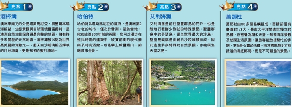 由布里斯本、雪梨等知名景點進出的傳統陸地行程,結合遊輪旅遊後,不僅能深入陸地行程難以抵達的特殊景點,也可搭配短小輕薄的行程,前進塔斯馬尼亞等知名島嶼。