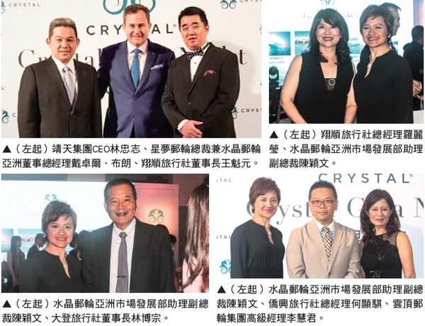 在晚宴中,水晶郵輪亞洲董事總經理戴卓爾.布朗、雲頂郵輪集團高級副總裁吳明發、雲頂郵輪集團市場部高級副總裁李鳳霞、雲頂郵輪集團台灣區業務部副總裁劉曉寧、水晶郵輪亞洲市場發展部助理副總裁陳穎文等高階主管全員到齊與業者交流。