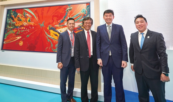 ▲(左起)新加坡旅遊局局長陳建隆、丹斯里林國泰、新加坡貿工部兼教育部高級政務部長徐芳達及雲頂香港副行政總裁兼執行董事林拱輝於「環球夢號」船身彩繪《海闊天空‧夢無際》前合影。