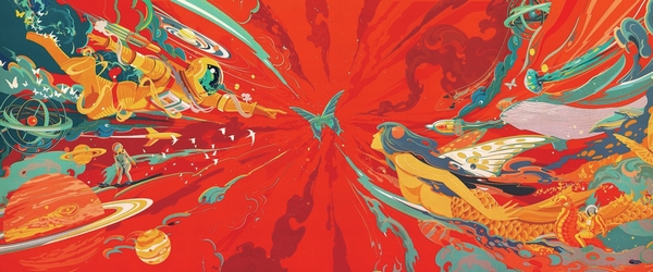 美人魚與宇航員共同象徵獨立、自信、無畏的新生代旅行者的故事主角,懷抱對未知的好奇和對探索的渴望,如振翅的蝴蝶掙脫束縛,奮力躍向全然自由的嶄新天地。在畫中,從深海而來的美人魚身披彩翼,衝破平靜的海面和宇航員在天空相遇。銀河星海茫茫,星際飛船和高空火箭急速掠過,而他們並肩攜手,坐看浩瀚宇宙的廣袤無垠和美不勝收,恣意開啟一段獨一無二的夢想旅程。當海洋遇上天空,當航海時代古老神秘的傳統遇上太空時代令人震撼的未來科技,一種探索世界的全新方式應運而生,就此寫下一場海闊天空的妙然邂逅。