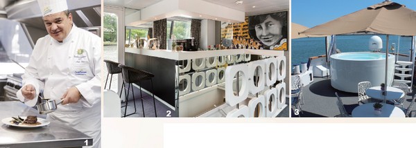 ▲1.請Chaîne des Rôtisseurs世界上最古老的國際美食協會的法籍廚師坐鎮,讓旅客都能在泛歐遊輪上品味到最純正的法式料理。2.休閒酒吧:餐前、餐後的好去處,最適合聚會、放鬆,欣賞船上各式表演活動。3.日光甲板:沐浴在陽光下,舒展身體,或懶洋洋地仰臥在躺椅上,讓自己在美麗的畫中游移。部分船型設有游泳池或SPA水療池。