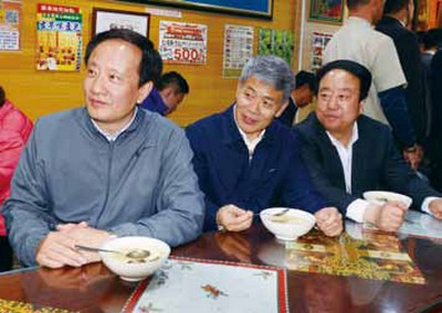 ▲寧夏回族自治區黨委書記李建華( 中) 、台北寧夏( 夜市) 商圈發展協會會長林定國( 左) 、台北市寧夏夜市古早味豆花老闆(右)。