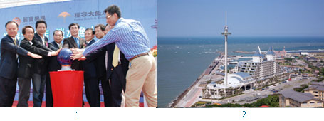 1.情人塔由福容大飯店連鎖集團董事長吳寶田(左4)、新北市政府副市長李四川(左5)與貴賓共同啟動。2.「福容大飯店 淡水漁人碼頭 情人塔」郵輪造型的飯店加上情人塔,十分吸引遊客目光。(圖片提供>芙蓉大飯店)