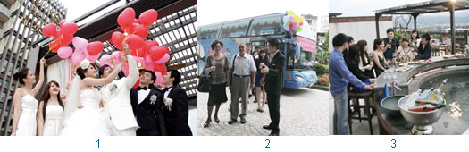 1.戶外池畔婚禮十分浪漫。(圖片提供>蘭城晶英酒店)2.蘭城晶英酒店包館婚宴專案貼心安排專車自台北接運賓客。3.滿百桌就送告別單身PARTY,契合年輕新人愛熱鬧的需求。
