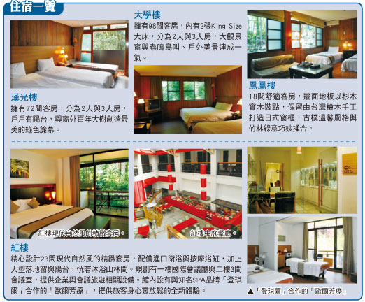 專案日期: 4 ╱ 1 ~ 1 2 ╱ 3 1 ; 平日價格:漢光樓雙人房NT$3,099一晚、三人房NT$3,949一晚;大學樓四人房NT$4,799一晚;暑假價格:漢光樓雙人房NT$3,329一晚、三人房NT$4,094一晚;大學樓四人房NT$4,859一晚;優惠內容:平日住宿一晚、自助式早餐、風味晚餐、客房礦泉水/咖啡包/茶包、含森林遊樂區門票、不含森林遊樂區停車費、夜間生態導覽。