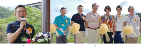 1.老爺集團執行長沈方正歡喜邀請各界體驗公園高爾夫運動。2.(左起)台灣公園高爾夫球推廣協會發起人羅正雄、老爺集團執行長沈方正、宜蘭縣政府工商旅遊處處長周慶安、財團法人希望基金會董事長紀政、奧運跆拳道選手蘇麗文及臺灣國寶級文學家黃春明。