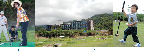 1.飛躍的羚羊」紀政享受揮桿樂趣。2.公園高爾夫運動,老少親子皆宜。