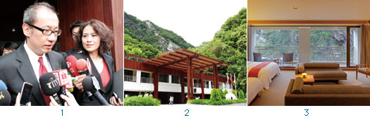 1.集團董事長潘思亮接受各界媒體專訪。2.山水環抱的太魯閣晶英酒店全新設計。4.行館-天祥套房(圖片提供>太魯閣晶英酒店)。