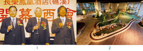 1.長榮國際公司董事長張明煜(左)、長榮集團總裁張榮發(中)與長榮鳳凰酒店董事長陳正曜共同為開幕舉杯慶賀。