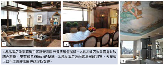 君品酒店汝采套房由知名設計師陳瑞憲以凡爾賽宮的大特里安農宮為靈感來源打造,在設計概念與選材上都以女性角度出發,包括玫瑰色大理石材、柔美色調、寬敞明亮的浴室、帶有綠意與陽台的餐廳、典雅四柱床等,採超高規格,手工縫製的床墊要價36萬,重現法國女性皇室貴族細緻風範。全室佔地53坪,搭配歐洲骨董與藝術品,最吸睛者為浴室天花板上以手工彩繪的希臘神話謬斯女神,正代表女性對藝術與美好生活的敏銳。凡入住汝采套房即提供私人管家服務,可提供24小時全天服務,一晚定價10萬元+10%服務費。