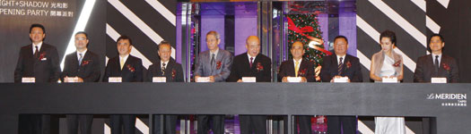 ▲寒舍集團創辦人蔡辰洋(左5)、寒舍餐旅總裁蔡辰威(右3)、寒舍餐旅董事長蔡伯府(左2)、台北寒舍艾美酒店總經理戴文龍(左1)、台北市長郝龍斌(左3)與政商界人士共同啟動台北寒舍艾美酒店的藝術大門。