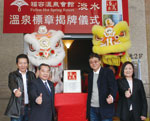 由麗寶機構投資,位於淡水地區的福容溫泉會館 淡水,深探地底1,506公尺,泉湧出含「碳酸氫鈉泉」及「食鹽泉」特殊結合的「黃金美人湯」,經過層層檢核,福容溫泉會館 淡水率先榮獲新北市觀光局頒發的淡水區第一張溫泉標章認證,於1╱20偕同新北市觀光局舉辦溫泉標章揭牌活動,特別邀請新北市新科觀光局長陳國君(右2)、立法委員李鴻鈞(左1)與麗寶建設機構董事長吳寶田(左2)、福容大飯店連鎖集團總監龎妤家(右1)共同為這張代表榮譽的溫泉標章揭牌,除了增加消費者安心泡湯新選擇,也為淡水溫泉觀光發展注入一股動能。(攝影>何孟杰)