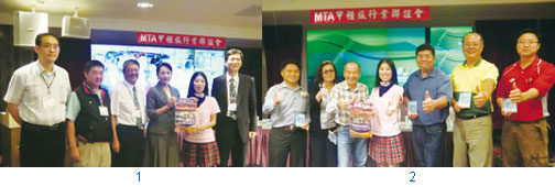 1.甲聯會會長吳佳怡(右2)致贈紀念旗予那米哥婚宴廣場總經理林麗華(右3),(左起)前會長李謙宏、前會長吳志浤、副會長孟志鈞、前會長羅崇漢。 2.甲聯會會長吳佳怡(左4)與花蓮特色聯盟(左起)向上泛舟、阿美小米文化館&地耕味、盟主多羅滿賞鯨總經理林正利、立川漁場、和平潛水等代表合影。
