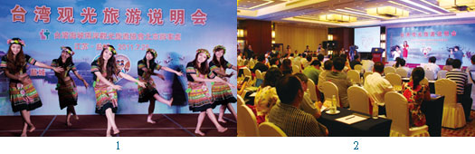 1.開場歌舞「阿里山的姑娘」台灣味十足。2.說明會獲江蘇省各旅遊局、業者及媒體關注。