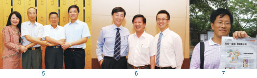 5..(左起)保保旅行社董事長戴啟珩、江蘇省旅遊協會副會長唐建國、台灣海峽兩岸觀光旅遊協會北京辦事處主任楊瑞宗與鹽城市旅遊局長史學健。6.(左起)長榮航空客運本部營業部港澳大陸課課長馬瑜光、鹽城台協會長陳宏昌及長榮航空客運本部營業部直客行銷課黃資堯。7.鹽城市旅遊局旅遊促進處處長吳志賓展示鹽城晚報對台灣觀光說明會的全版報導。