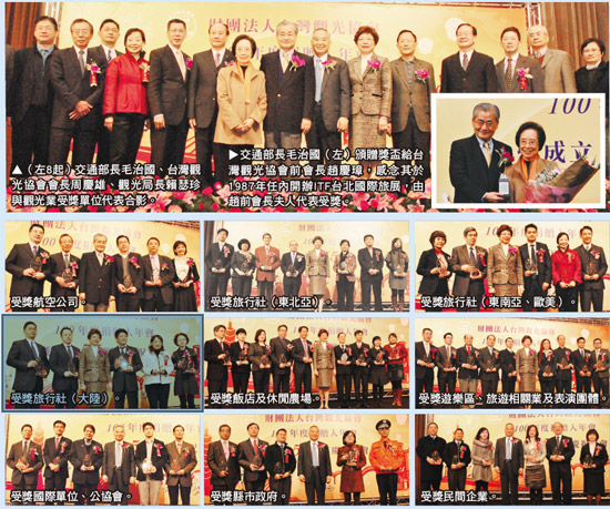 (左8起)交通部長毛治國、台灣觀光協會會長周慶雄、觀光局長賴瑟珍與觀光業受獎單位代表合影。