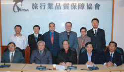 由旅行業品質保障協會所推動的「台灣旅行安心GO!購!夠!旅行購物保障制度」,於10月27日正式授證,(前排左起)新亞旅行社副董事長張政美、台灣省旅行商業同業公會聯合會理事長黃瑞榮、旅行業品質保障協會常務理事長王啟漢、交通部觀光局業務組副組長簡義鴻、花蓮手工藝品中心總裁郭淵源;(後排左起)旅行業品質保障協會秘書長陳怡全、中華民國旅行商業同業公會全國聯合會秘書長許高慶、中華民國觀光導遊協會理事長林燈燦、旅行業品質保障協會常務監事張榮坤、海峽友誼旅行社總經理連郁卿、貴賓旅行社總經理王全玉。(撰文‧攝影>蔣德誼)