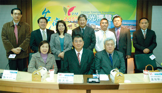 (左起)台北縣旅行商業同業公會理事長張玉霞、台北市旅行商業同業公會理事長姚大光、台灣省旅行商業同業公會理事長黃瑞榮共同在台灣地圖上插上台灣觀光博覽會的小旗子,象徵活動正式起跑。首度由旅遊業界策劃發起,以推廣國旅市場為主調的「2007台灣觀光博覽會」於日前舉辦記者說明會,宣布正式展開活動,主辦單位之一的台北市旅行商業同業公會理事長姚大光率先表示,「在政府以及業者的大力推廣之下,國內旅遊風氣大開,旅遊已經成為民眾生活不可或缺的一部分,一年高達2,800萬人次的龐大國旅市場更是商機無限。近年來各縣市相關單位在觀光方面的推展可謂不遺餘力,但有時往往未能和國旅做結合,非常可惜。因此希望能藉著觀光博覽會的舉辦,結合國內相關業者,並邀集各地方縣市政府,將觀光推廣的成果商品化,並在展銷之外舉辦產業研討主題論壇以及各項買家活動,讓消費者/供應商/中間業者都能獲益,達到三贏的局面。」