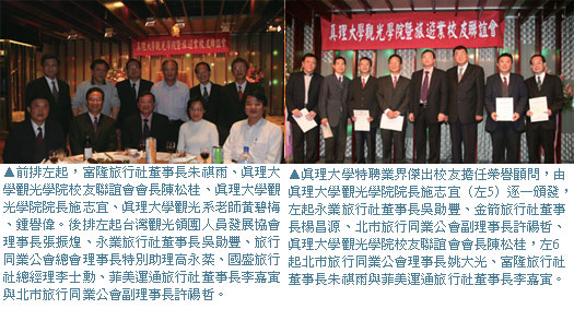 前身為淡水工商專校的真理大學不啻為旅遊業大搖籃,真理大學觀光學院暨旅遊業校友聯誼會日前舉辦新春餐會,多位畢業自真理大學的旅業朋友紛紛出席,包括備受業界尊敬的資深前輩與公協會理事長們,場面相當熱鬧。