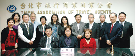 (前排左起)依序為本次例會輪值主席行家旅行社執行長白中仁、本次主講人世達通運公司業務總經理朱及先、多聞會會長北極星國際旅行社商務部副總經理徐敬德。