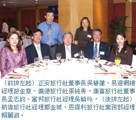 (前排左起)理想旅遊顧問黃政賢、台北中華美食展籌備委員會召集人邱平興、群英會會長紀正德、元和旅行社董事長許明春、群英會前會長紀棟興、飛龍旅行社董事長蕭國光,(後排左起)新銳旅行社羅崇漢、港祥旅行社陳興隆、世界旅行社總經理楊許虎。