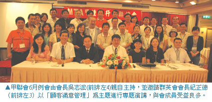 甲聯會為提升會員經營能力,在例會固定安排專業主題演講或業者經驗分享,6月則邀請群英會會長紀正德以「顧客滿意管理」為題演講。他表示想讓顧客滿意就要「掌握關鍵時刻」,得宜處理危機十分重要,並提出新的管理除了關注4P—產品、價格、管道與促銷之外,還必須加上1P—Pride尊寵,而對於經營者,他則強調首先要選擇適當人才,再來思考知識可否適度複製,以建立如Q&A手冊等知識管理。紀正德妙語如珠,30分鐘無冷場,博得現場一致好評,具體提點更讓會員受益匪淺。
