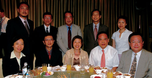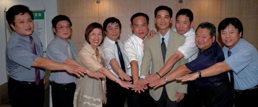 ▲台北縣旅行商業同業公會日前舉行改選,晚會上冠蓋雲集。(前排左起)台北縣政府建設局局長蔡麗娟、台北市旅行公會副理事長許禓哲、前任北縣旅行公會理事長張玉霞、新任理事長張永成與海基會旅行服務處處長劉克鑫。(後排左起)台北縣旅館公會理事長李志漢、旅行公會總會秘書長許高慶、屏東縣公會理事長伍天爵、ANTOR會長施春庭與台北縣政府建設局行銷課長陳玫秀。