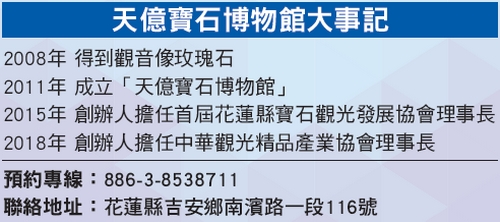 創立於2011年的天億寶石博物館,天億2字取自於「天下珍品滿漢唐,億萬瑰寶盡收藏」對聯的首字,博物館所位於的花蓮擁有壯麗山海,更孕育了許多「美石」,成為眾所皆知的「玫瑰石故鄉」。