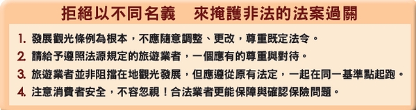 而不是等真正碰到執行上的阻礙後,才來怪罪發展觀光條例過時,是否跳脫原有展觀光條例的規定,想要另外新增特定地區小旅行專章。然而輔導團隊又想出多美的字句、多吸引人的「特定地區小旅行合法納管,共創觀光新藍海」,想讓全台民眾一起來支持此修改法案通過!建請不要再以青創之名,行非法經營之實,非法就是非法!