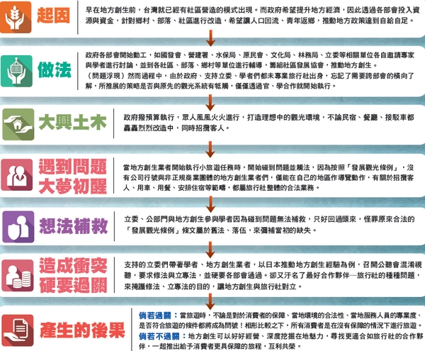 近期國民旅遊市場最大的話題,莫過於地方創生、社區旅遊的議題,由政府許多部會帶頭、邀集專家學者共同發想、輔導當地,並不斷投入資金,今年撥款400億,歷年來總投入1,500億元,風風火火的大肆執行,但如此龐大的規模與資金投入,卻因為當初未發現該理念與「發展觀光條例」相互牴觸,因此現在不斷透過施壓等方式呼籲修法,如此作法自然引起長期遵守法律執行業務的旅行產業反彈。