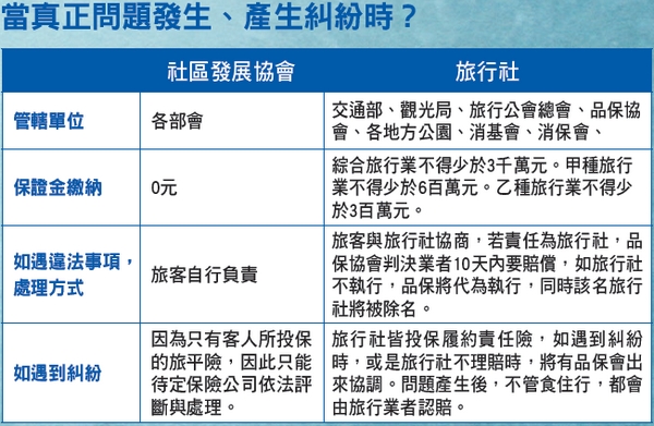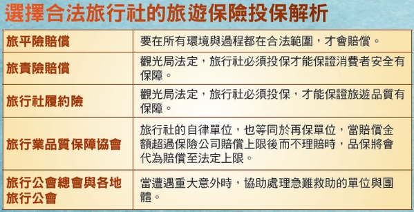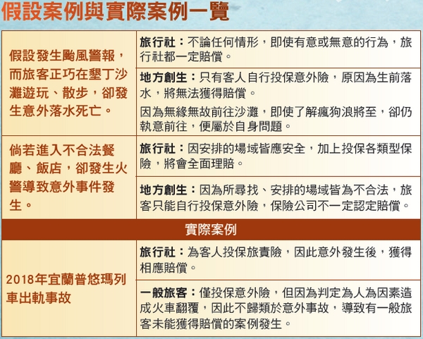 台灣旅行業國民旅遊發展協會總召集人暨旅行公會總會國內旅遊委員會總召集人林義順表示,旅行社因為有投保旅責險,因此當旅客在旅程中發生意外,都將依法全權負責並賠償。而消費者自行投保平安意外險,當發生問題時,是必須經過保險公司判定一切過程是否在完全合法的情形下,才分層處理,所以出險不一定獲得應有的理賠。