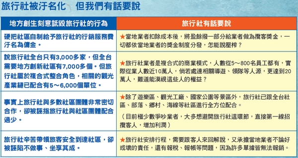 台灣欲效法日本創生的方案,歷年來投入1,500億元的公帑積極輔導,但所輔導的社區團體有極少數無法蓬勃發展。為了幫他們解套,政府反倒過來要求針對發展觀光條例進行合理化的修改,同時將旅行社定為代罪羔羊,不斷被抹紅、打黑,對於這些不公平的對待,旅行社有話要說!
