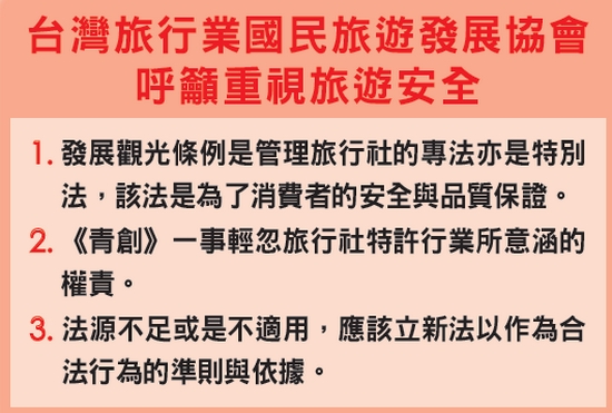 不僅如此,《青創》一事輕忽旅行社特許行業所意涵的權責,發展觀光條例是管理旅行社的專法亦是特別法,該法是為了消費者的安全與品質保證。產官學及消保會不斷的努力制定,包括旅遊責任險、旅遊履約險、品質保障協會、定型化契約等等,如今即將面臨重大考驗。