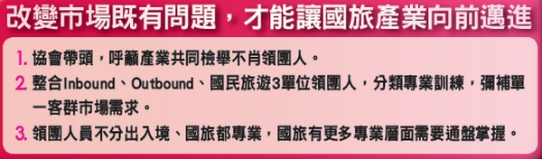 如果有機會將這3個單位的人會合,在原有的帶團專長下,再次分類專業訓練,彌補另一單位客群需求的專業。不管在心態上、用詞內容、招呼方式、行程上需求,完全不同於原來的專長。