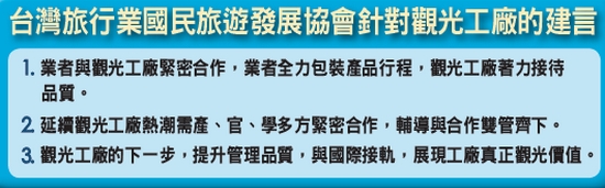 最後也希望所有政府單位,與旅遊有相關的部份,能產官學合為一體,既是輔導也是合作,有了人潮、也有了錢潮、也改變了原有的環境需求。旅行社的專長是行銷通路,有一定的客源,總之優質觀光工廠,最後也需有適合該產品的人潮。