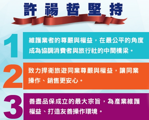 因為是業者,天擎旅行社董事長許禓哲更能了解業者的痛,此次重出江湖的參選,就是要為同業搭建起一道防線,為旅行社的尊嚴而戰,要讓同業能在品保協會的支援下,不用擔心受怕,而是能安安心心做生意、賺取應有的商機與利潤。
